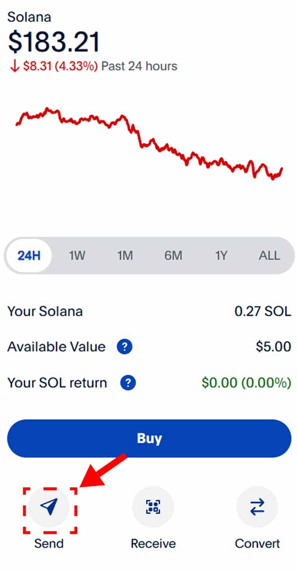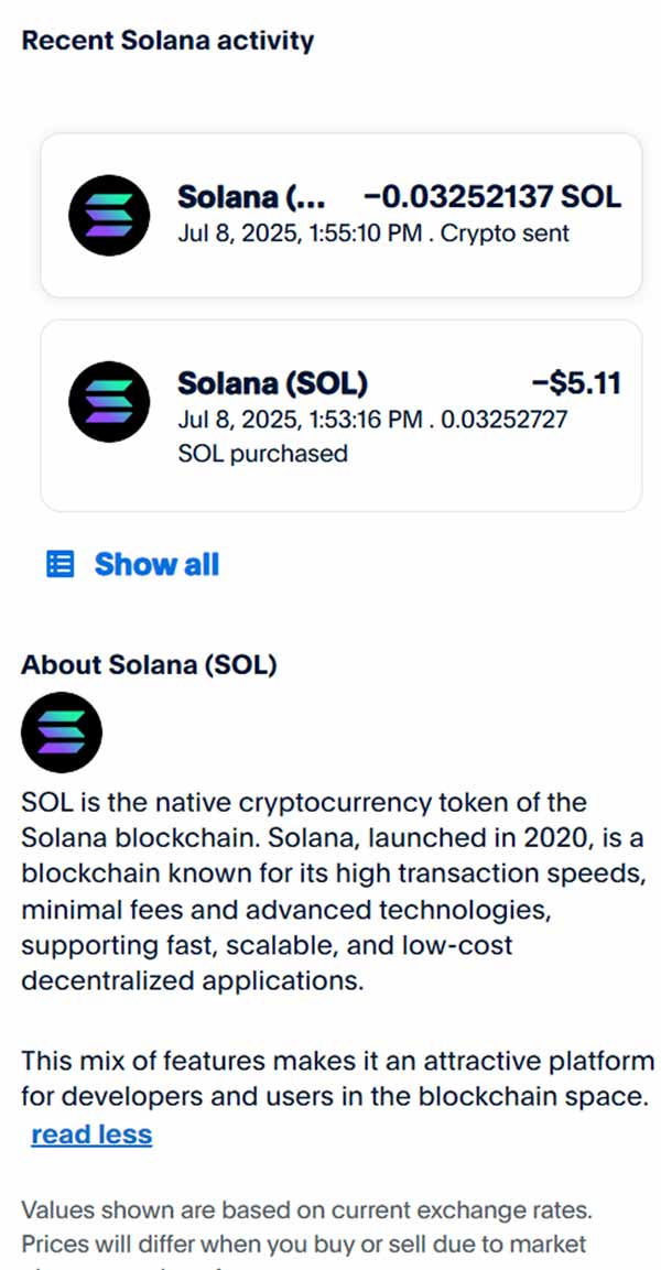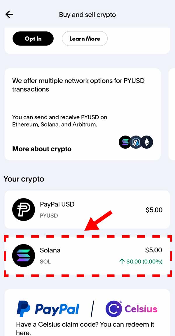 5) Back into Paypal, in your crypto tab, you can find the Solana you purchased earlier. Select it