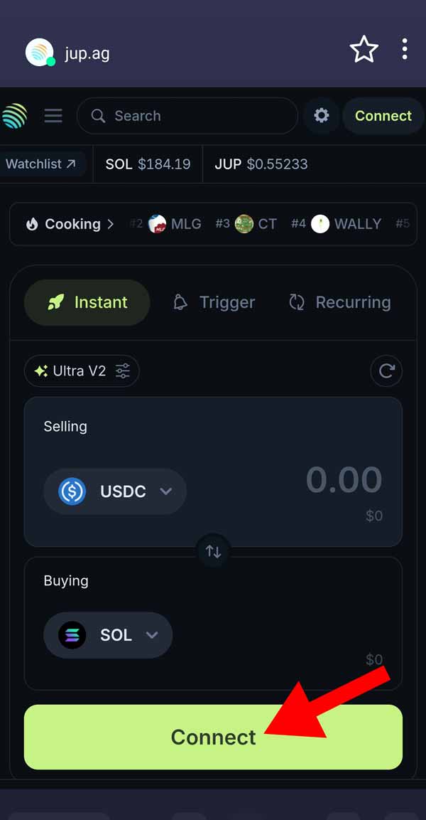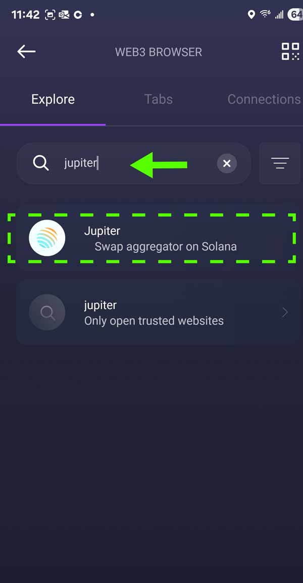 2) Type Jupiter into the search and select the swap aggregator tab that appears