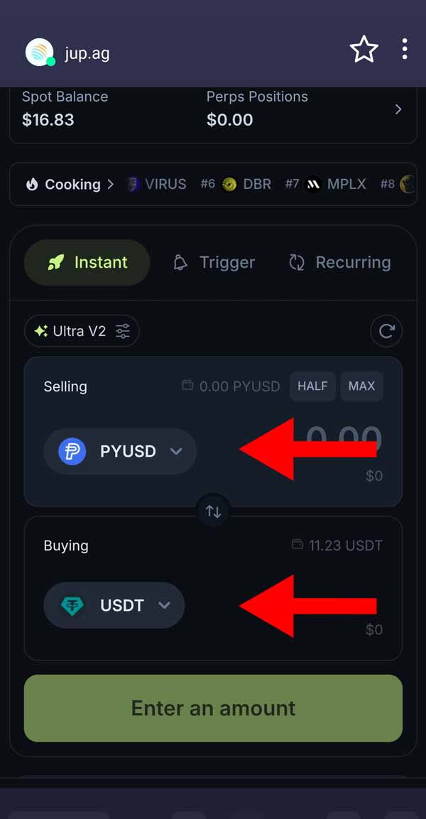 5) From the drop downs, under Selling choose PYUSD. Under Buying choose USDT