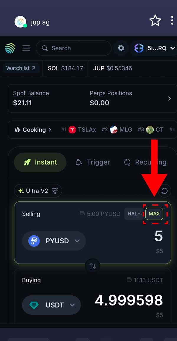 6) Select MAX to trade all of your PYUSD to USDT. Then click on the swap button and confirm your wap