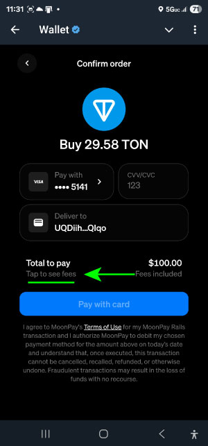 3) Before confirming Select the Tap to see fees button