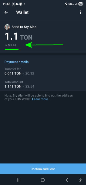 4)Enter the amount of TON coin to send. You will see the dollar amount below the TON coin amount to see how much the TON coin amounts to in dollars. Make sure this equal to or above the dollar amount you owe on your invoice. Confirm send when its good.